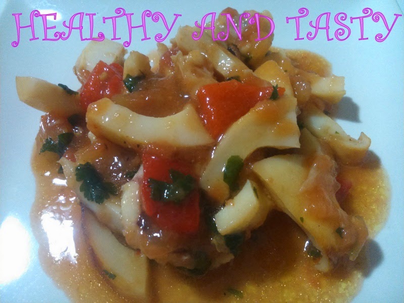 Primero asamos el choco en una plancha. Cuando se haya enfriado, lo cortamos en tiritas y lo ponemos en un bol. Añadimos el tomate troceado y lo estrujamos un poco con un tenedor. A continuación agregamos los pimientos cortados en tiras, el culantro picadito y aliñamos con sal, vinagre y aceite de oliva. Mezclamos todo bien y guardamos en la nevera hasta la hora de servir.