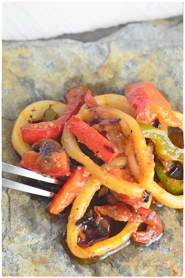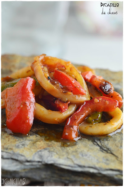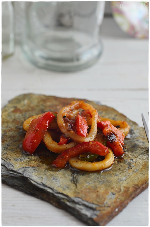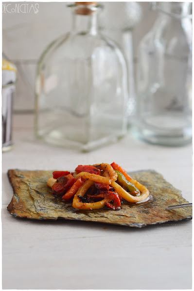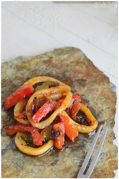 Simplemente tenemos que hacer a la plancha el calamar, en tiras finas, y mezclar con un sofrito que hice con cebolla, tomate maduro triturado y tiras de pimiento rojo y verde. Se aliña con sal, aceite y vinagre, y a disfrutarlo en frío