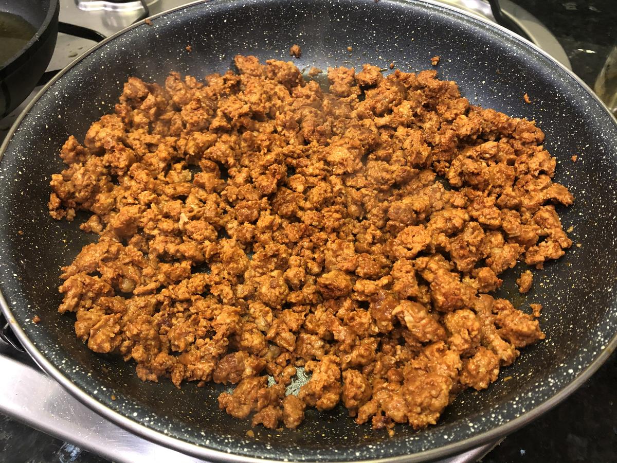 5. Para cocinarlo, podríamos hacerlo en el robot con el programa de cocción lenta P1, 130º, el tiempo no lo sé, sería ir tanteando hasta que estuviera listo. Pero queda mucho mejor preparado en la sartén, asique lo haremos allí calentando un poquito de aceite y añadiendo la cantidad de picadillo que vayamos a gastar en ese momento.