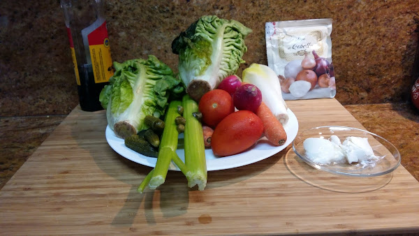 1 endivia, 1 tomate, 1 zanahoria, 1 cogollo de Tudela, 2 rabanitos, 1 ramita de apio blanco, 3 alcaparras, 3 pepinillos en vinagre.