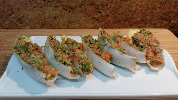 Mezclamos la salsa con el picadillo y rellenamos las hojas de endivia.