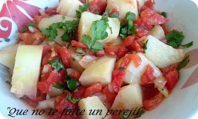 Como contaba en la anterior receta del picadillo, antiguamente se conservaban los tomates del verano para poder usarlos en invierno. Esos eran los que se utilizaban es estas ensaladas. Actualmente los podemos encontrar enlatados y listos para usar. Claro está, que nunca será lo mismo, pero si utilizamos tomates envasados de calidad el resultado es muy aceptable. Un buen aderezo es indispensable.