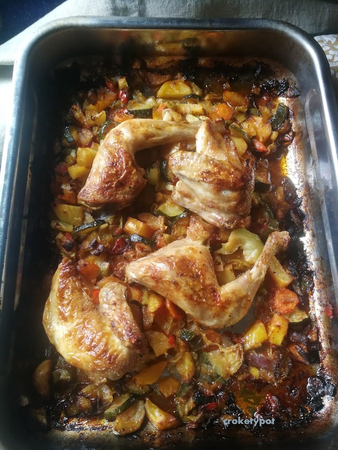 Pondremos el picantón primero con la piel hacia abajo, con un chorreón de vino y lo metemos en el horno.