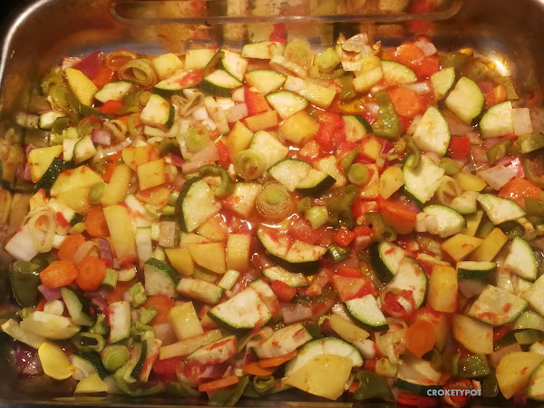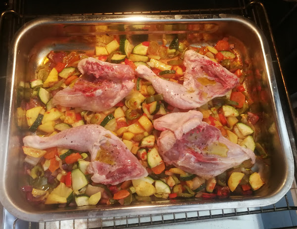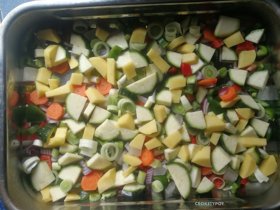 En la fuente de horno, ponemos aceite de oliva y todas las verduras troceadas.