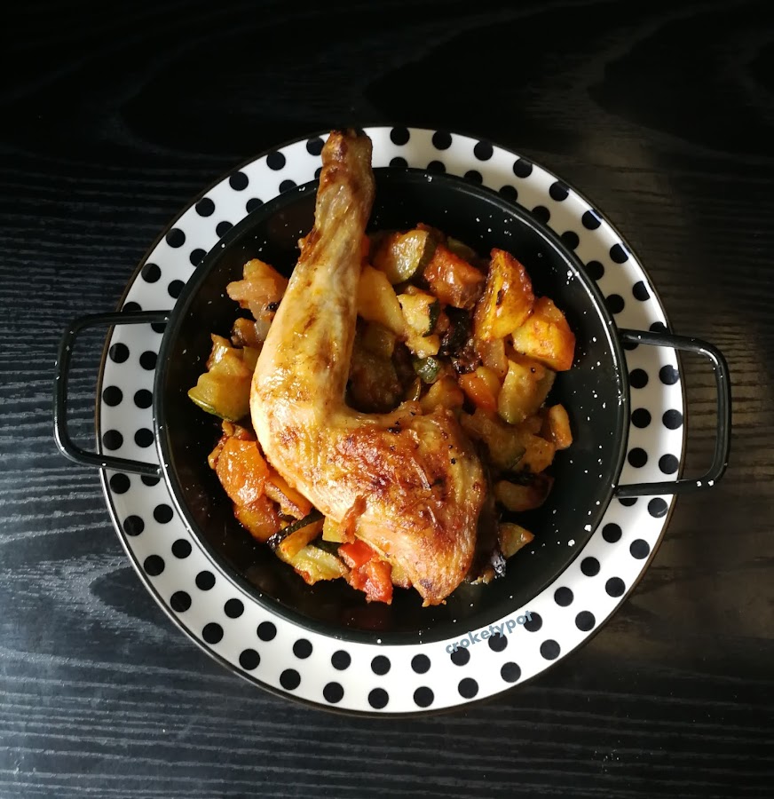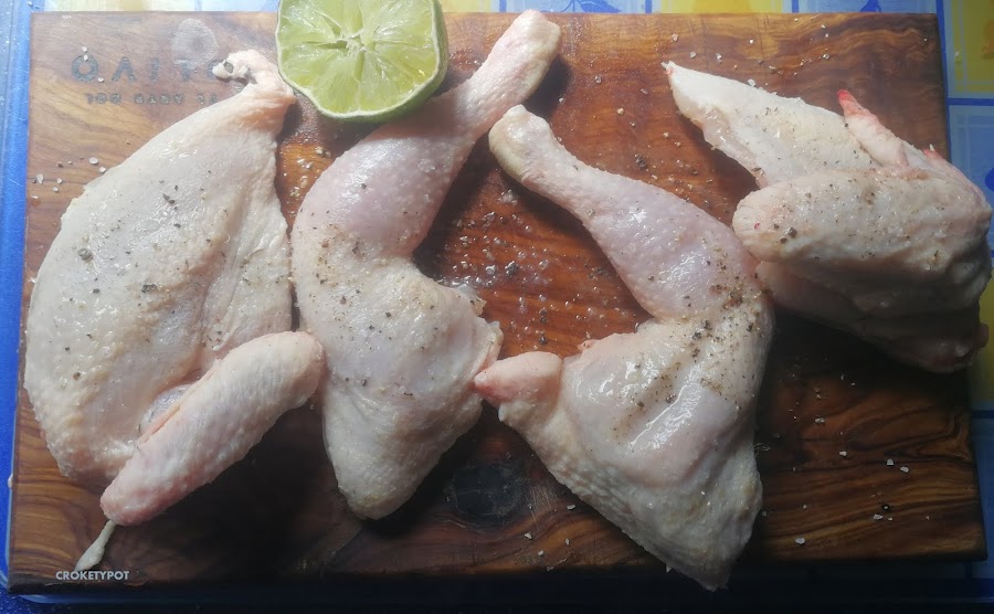 ELABORACIÓN: Limpiamos el pollo y lo cortamos en cuartos, se salpimenta, lo regamos con un poco de lima o limón y lo dejamos reservado mientras preparamos las verduras.
