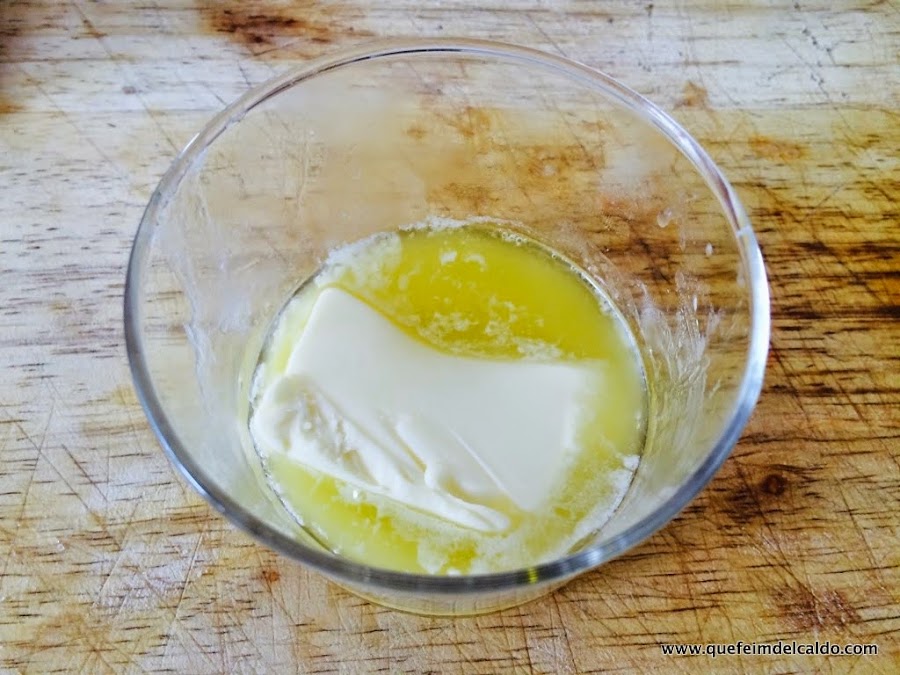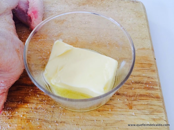 Preparamos la salsa para rociar el pollo, para ello ponemos dos cucharadas de mantequilla ablandada (para conseguir que la mantequilla esté blanda la ponemos unos segundos al microondas, o la dejamos la noche anterior fuera del frigorífico).