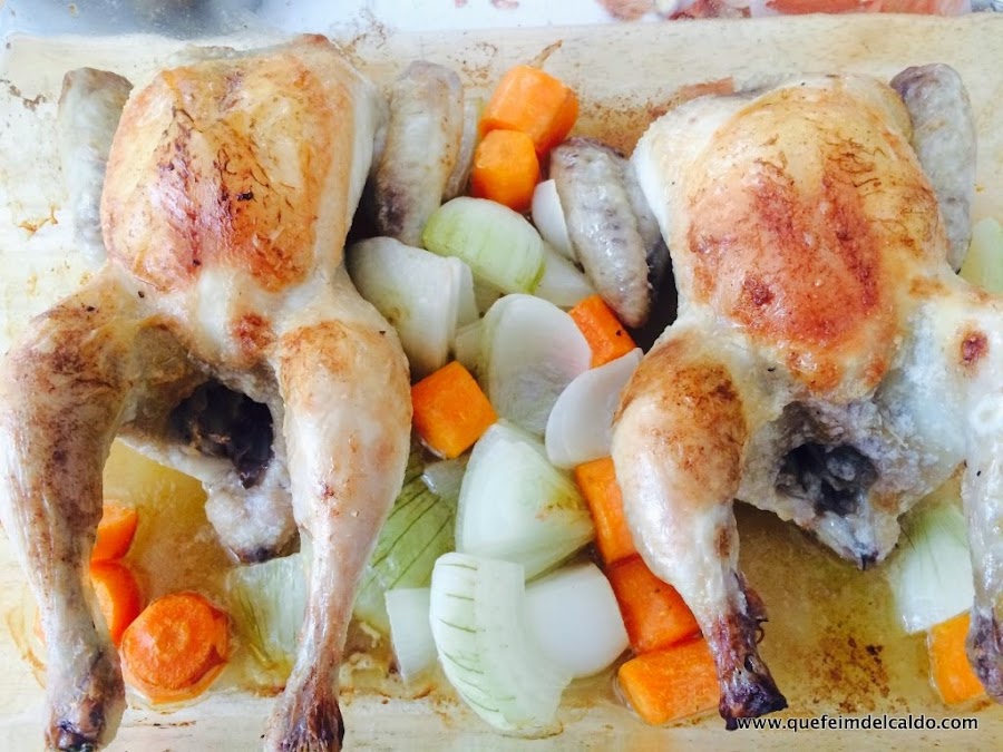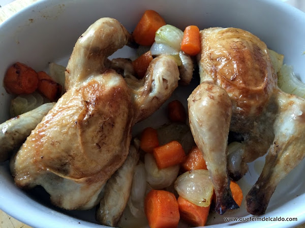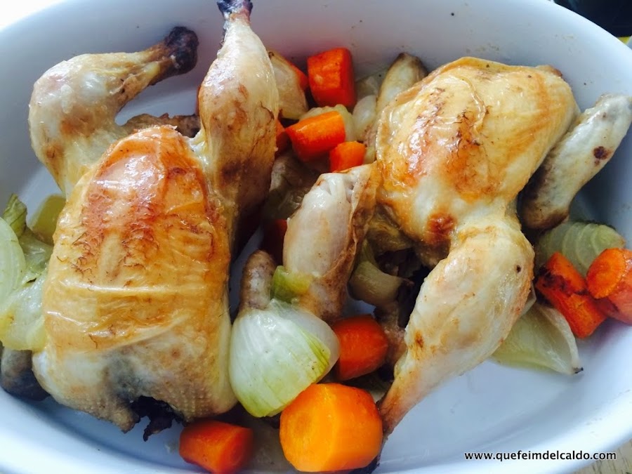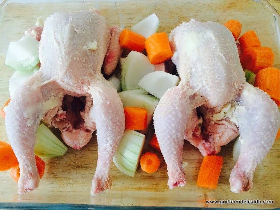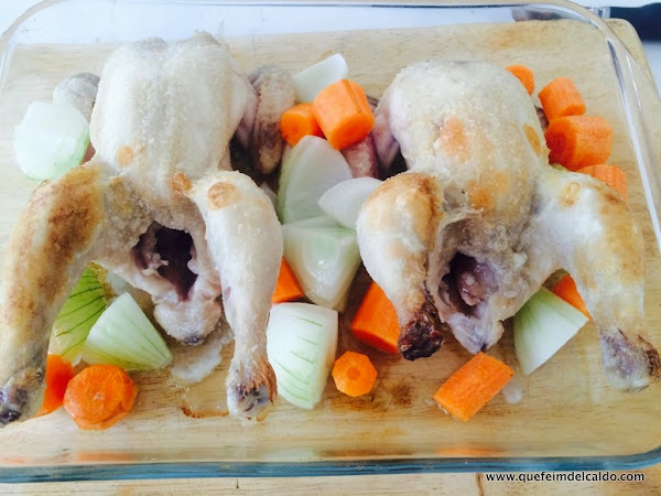 Ponemos en una fuente de horno el picantón con las pechugas hacia arriba, colocamos también la zanahoria y la cebolla tierna troceada.