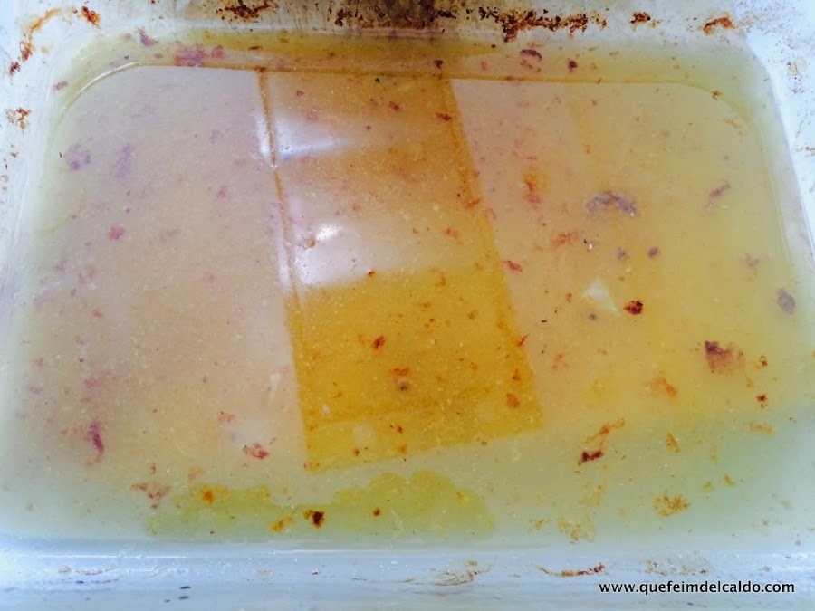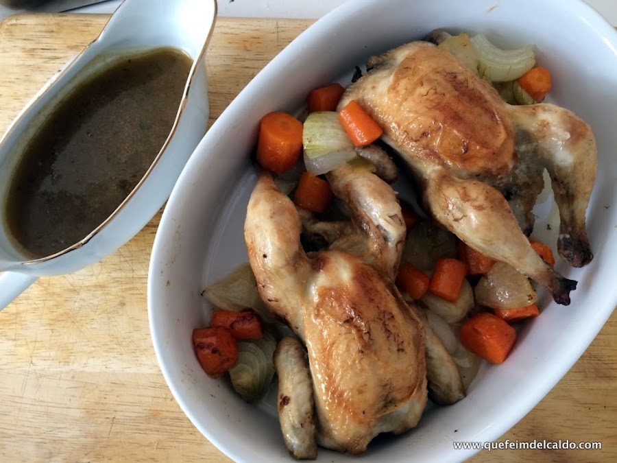Solo nos queda ahora el jugo que ha desprendido el picantón, lo añadimos al cazo donde tenemos nuestro caldo reducido.