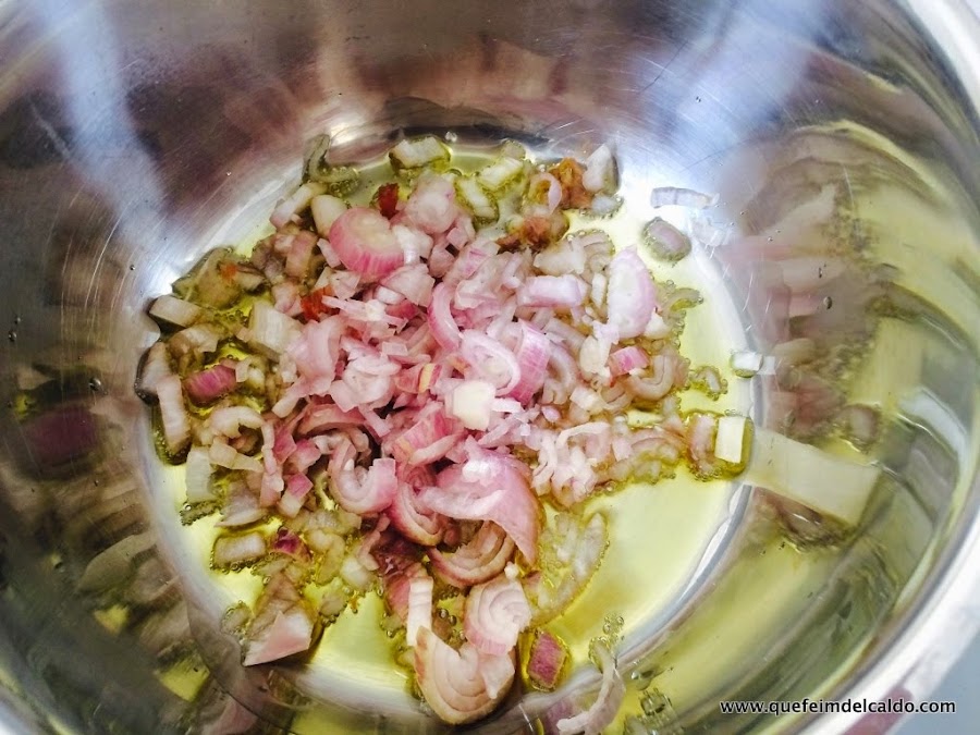 Cortamos las 5 chalotas muy finas, en una olla las pochamos con una cucharada de mantequilla durante 2 minutos.