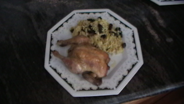 Normalmente los picantones ya vienen limpios, sin visceras, los salamos ligeramente, no mucho, les ponemos por dentro y por fuera margarina, y dos pastillas por picanton de cubitos magi, desmenuzadas...... los envolvemos con el papael de plata, al horno, precalentado a 250 º, yo hoy los tube como hora y media, miestras preparamos el arroz, tan facil como hervir arroz, yo uso largo, unos 18 minutos, lo escurrimos y lavamos con agua fria, cuando este muy seco, en una sarten freimos unas pasas de corinto, cuando estan gorditas, le añadimos el arroz, y curry, removemos, y cuando empiece hacer una capita en el fondo, apartamos, mientras sacaremos los picantones del papel de plata y los doraremos, cuando esten emplatamos y a comer!!!!!