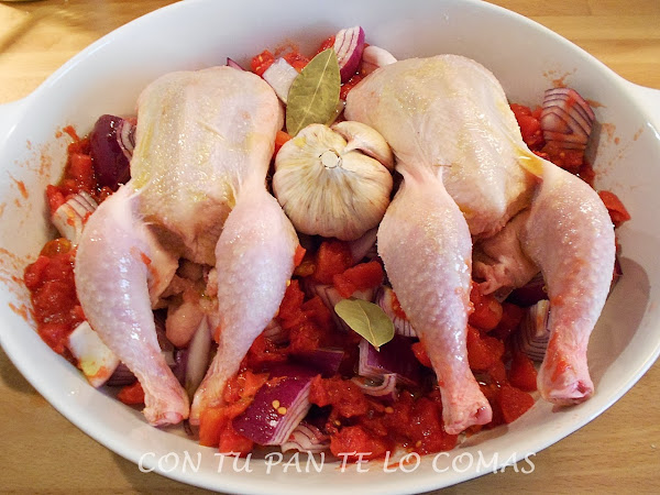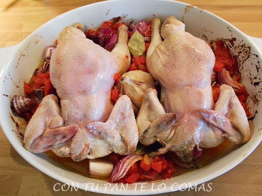 1. Salpimentamos los picantones. Cortamos la cebolla en trozos grandes, pelamos y troceamos los tomates.