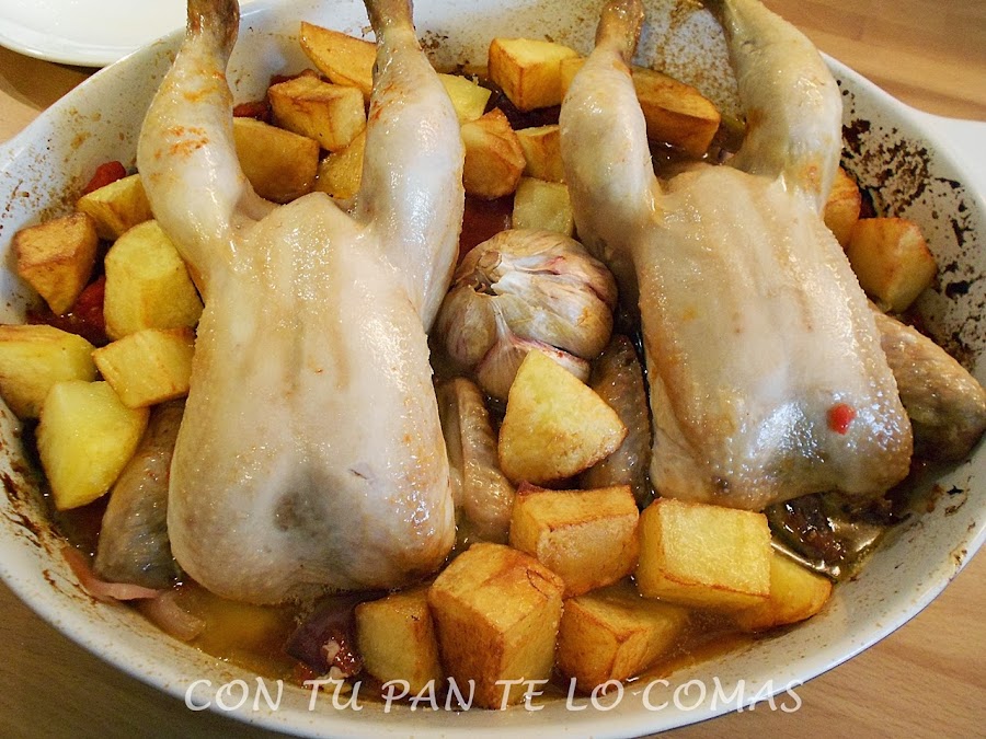7. A los 30 minutos les volvemos a dar la vuelta, añadimos las patatas fritas y volvemos a meterlo en el horno hasta que estén dorados y la piel crujiente, unos 10-15 minutos.