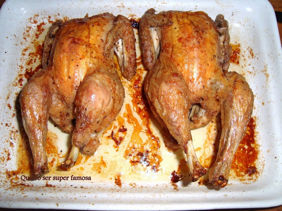 Poner las aves con las pechugas hacia abajo en una bandeja para horno. Condimentar con aceite de oliva (sin excederse) y cocinar por espacio de una hora aprox. Cuando los veáis completamente dorados darles la vuelta para que cojan color las pechugas. Son tan pequeños que solo hay que hacerlo una vez.