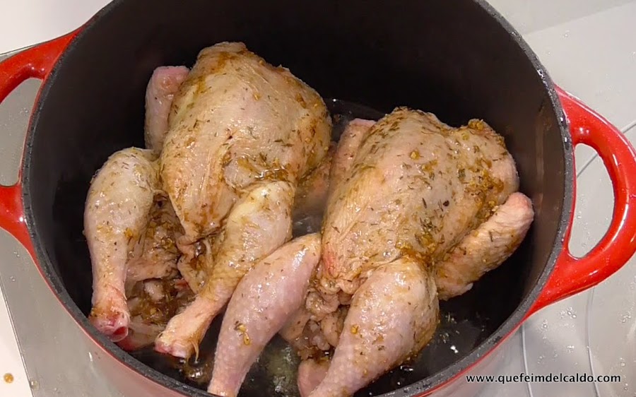 Una vez empieza a hervir, reducimos el fuego a 3-9, tapamos y dejamos cocinándose durante 30 minutos, cada 10 minutos damos la vuelta a los picantones.