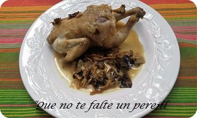 Incorpora los picantones. Pon el laurel, el caldo de ave y el agua previamente colada de hidratar las setas.