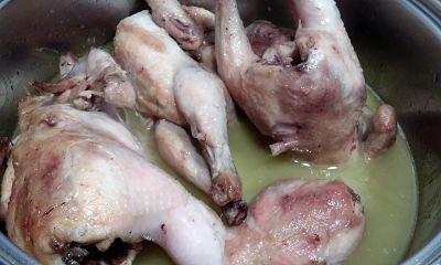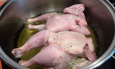 Ponemos a calentar abundante AOVE en una cacerola. Doramos los picantones a fuego medio. No me cabían todos a la vez, así que lo fui haciendo de dos en dos.