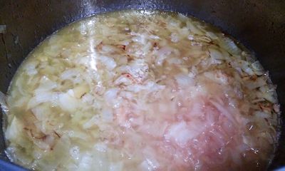 Cuela el aceite. Vuelve a poner de ese mismo aceite la cantidad suficiente para dorar la cebolla picada y los dientes de ajo laminados.