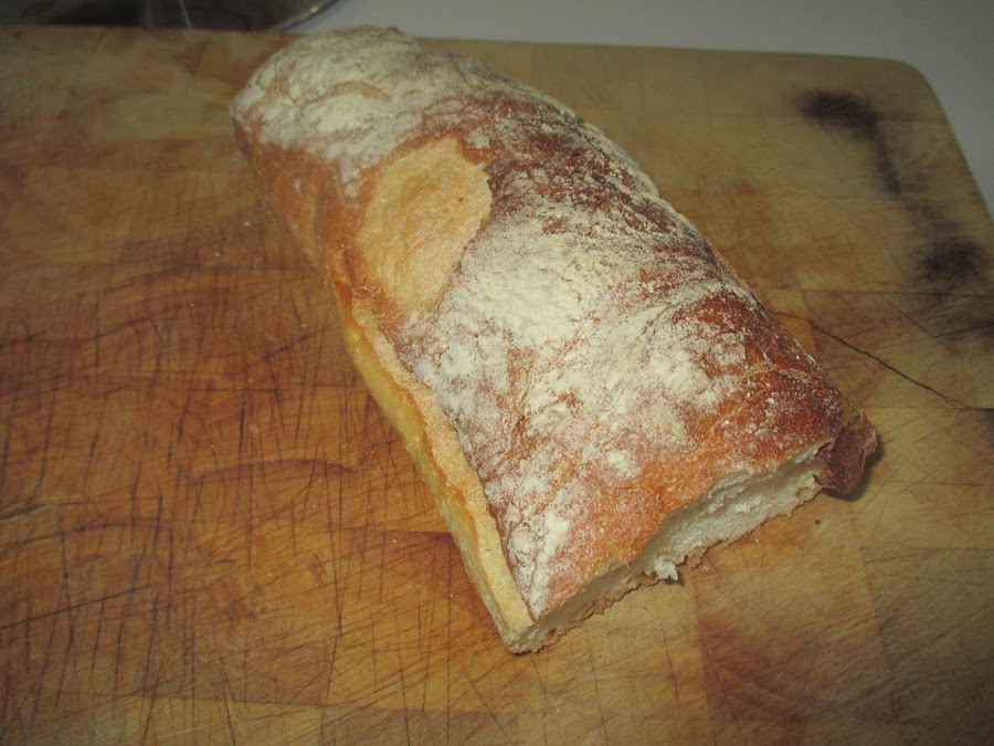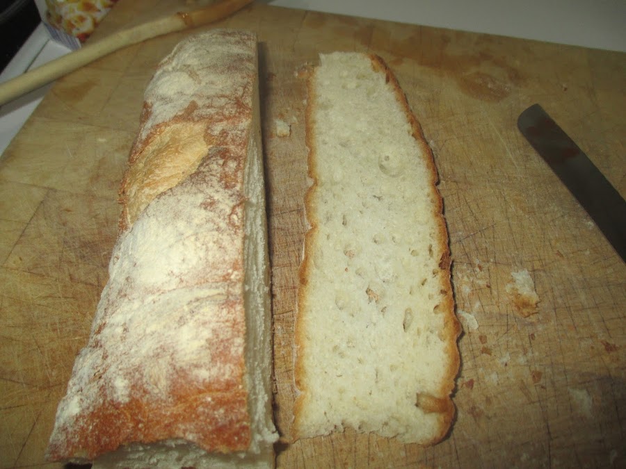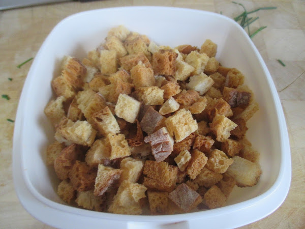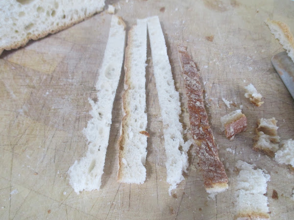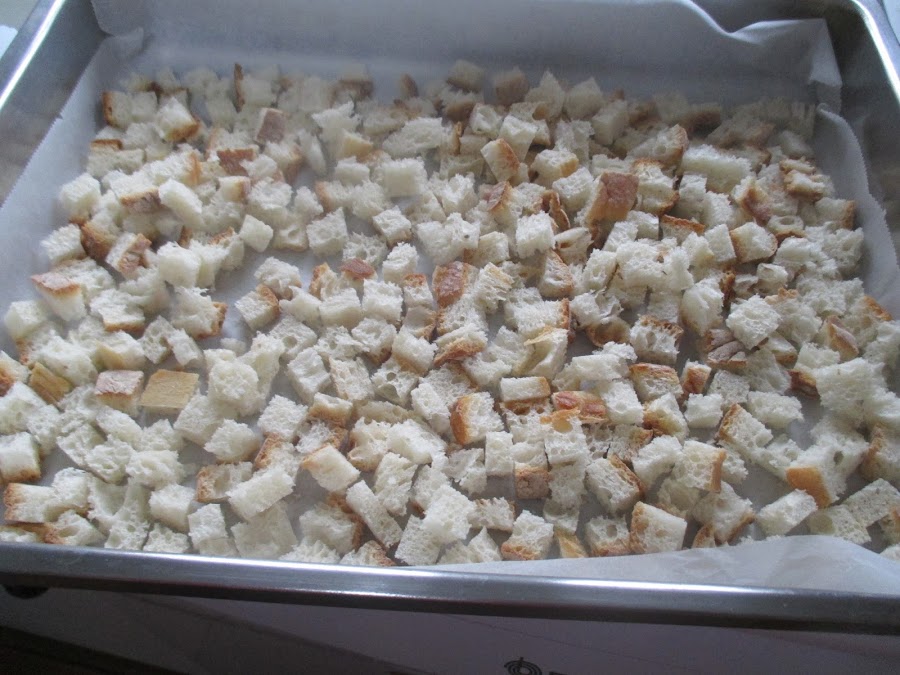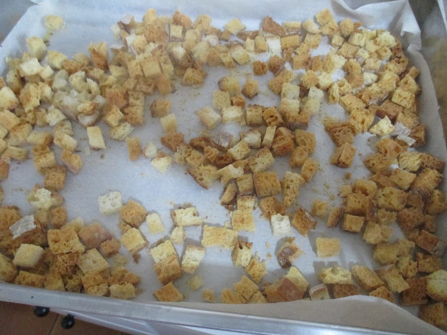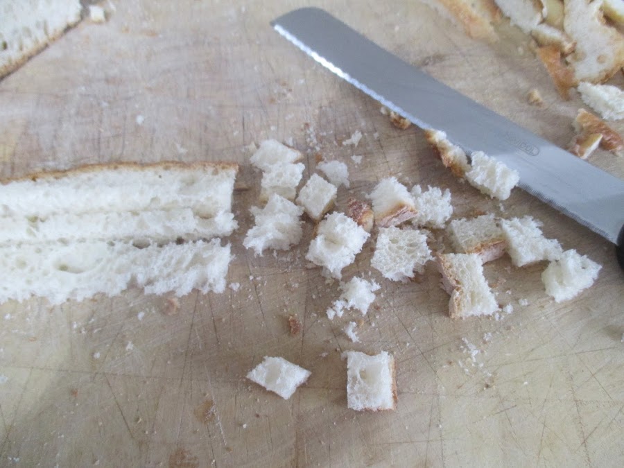 Cortamos el pan, en rodajas, luego en tiras y luego en daditos. Cortar siempre el pan con cuchillo de sierra si no queremos estropear los filos de los cuchillos.