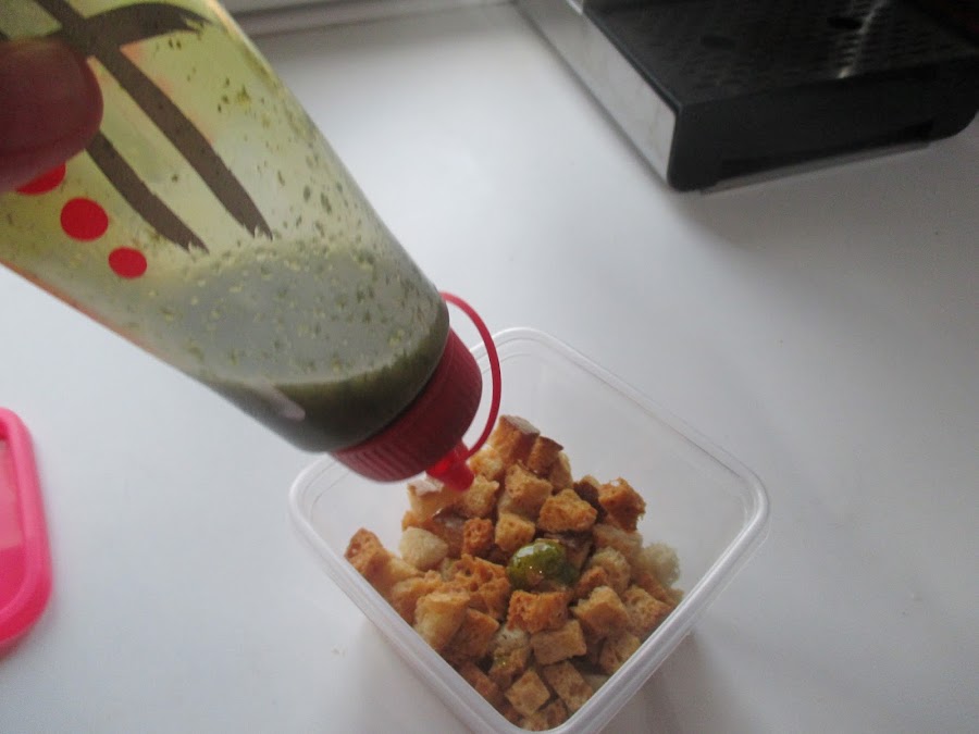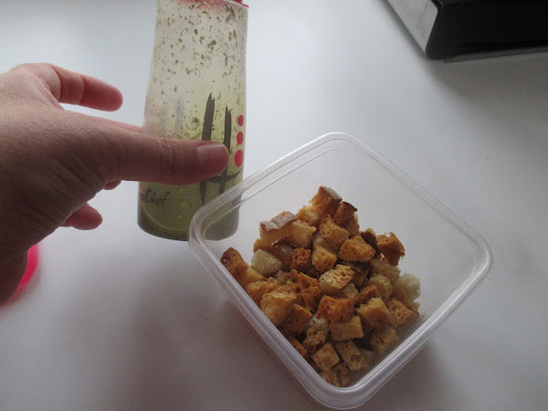 Ahora llega la hora de darles un toque especial...pon el aceite o la mantequilla derretida con la especie elegida. En esta ocasión pongo aceite de oliva virgen con ajo y perejil todo triturado con la batidora, (una mezcla que suelo tener en la nevera siempre preparada para cocinar) cierra el táper y mézclalo suavemente, ve probando hasta que los tostones estén a tu gusto de sabor y listo para usar. Buen provecho.
