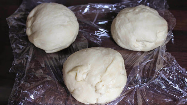 4. Pasado este tiempo, ponemos la masa encima de una superficie ligeramente enharinada y la desgasificamos. La dividimos en tres partes iguales y les damos forma de bola.