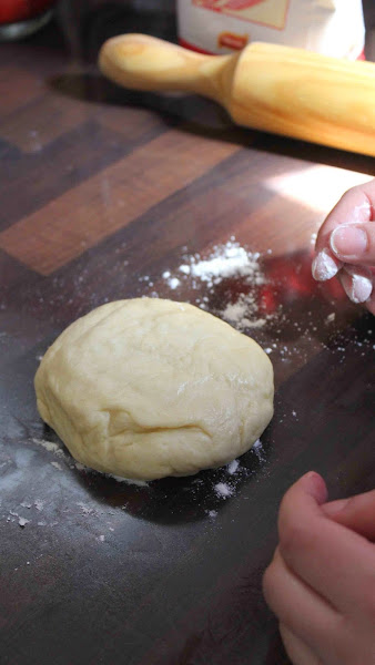 5. Cogemos una bolita de masa y la extendemos sobre una superficie ligeramente enharinada. Primero la extendemos un poco con la mano dándole una forma ovalada y luego nos ayudamos con el rodillo para extender más.