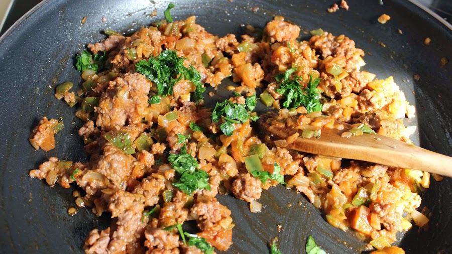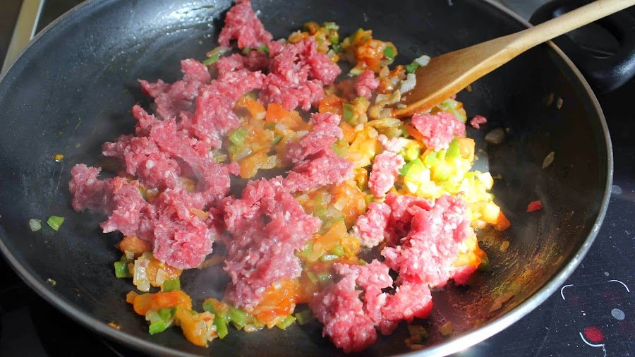2. Añadimos la carne picada y removemos. La carne no se tiene que hacer del todo ya que se terminará de hacer en el horno. Entonces nada más se quita el color al crudo de la carne, la retiramos.
