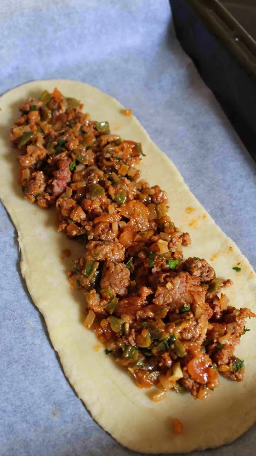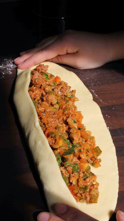 6. Ponemos 2-3 cucharadas del relleno de carne (ya frío) y cerramos los bordes dejando el centro sin cubrir.