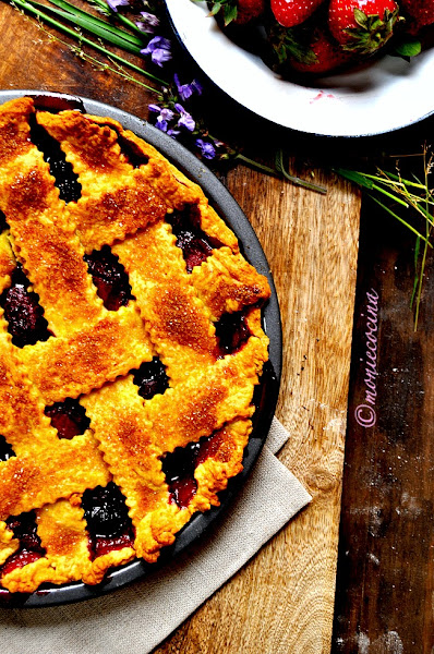 Colocamos el relleno de fresas escurriendo el jugo que hayan escurrido y colocamos en forma de rejilla la parte de arriba con la masa que nos quedaba. Espolvoreamos azúcar por toda la masa y horneamos 30 minutos a 180 grados o cuando veamos que la masa está tostada.