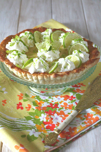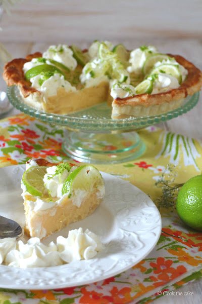 Desmoldamos el pie y lo colocamos en un plato o cake stand. Hacemos unas rosetas de nata (crema de leche) en la tarta y adornamos con unas rodajas de lima partidas por la mitad y ralladura de lima espolvoreada por encima.