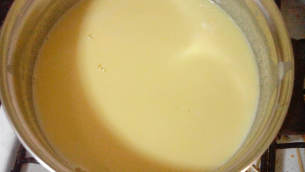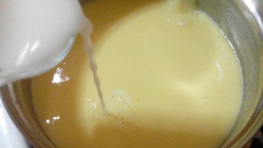 En un cazo mezclamos muy bien hasta que todo esté integrado, leche, leche condensada, limón y yemas.