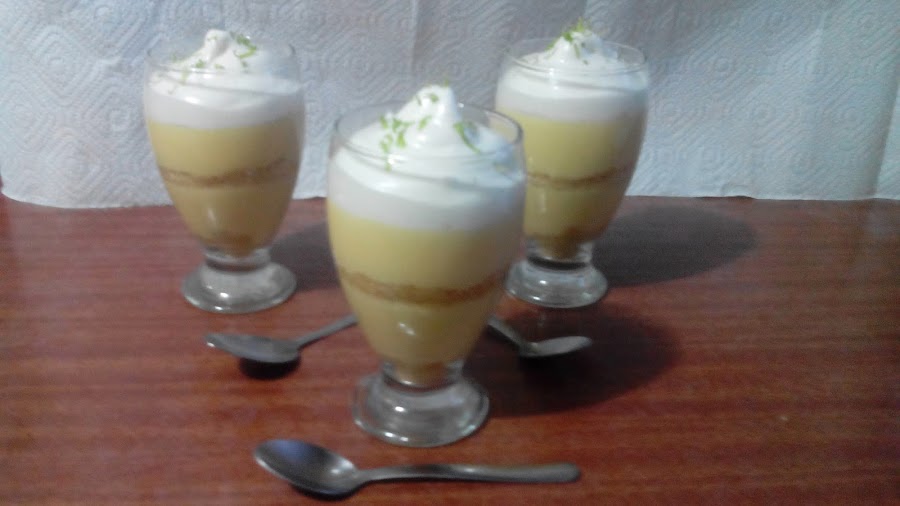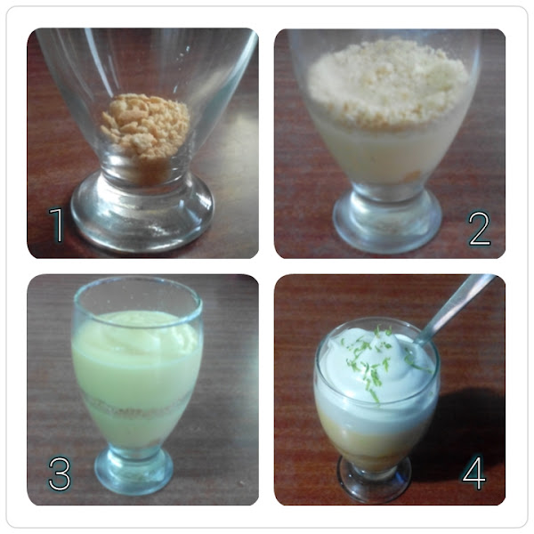 En las copas comenzamos colocando una capa de galletas molidas y con cuidado ponemos una capa gruesa de nuestra preparación, aproximadamente 10 cucharadas. Dejamos enfriar en el refrigerador y hacemos lo mismo, una capa de galletas y una capa gruesa de la preparación de limón.
