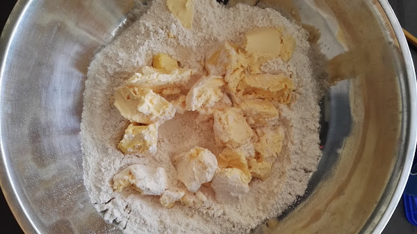 Mezclar harina, azúcar y sal en un recipiente grande y agregar la mantequilla fría cortada en cubos.