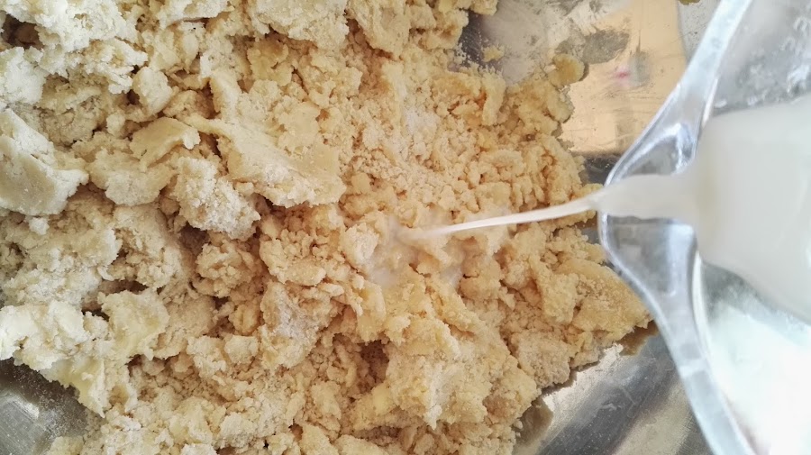 Con las manos o con la ayuda de un tenedor o un corta pastas vamos mezclando la mantequilla hasta que la masa tenga consistencia arenosa o como copos de avena, entonces agregamos por pocos la leche fría y seguimos mezclando.