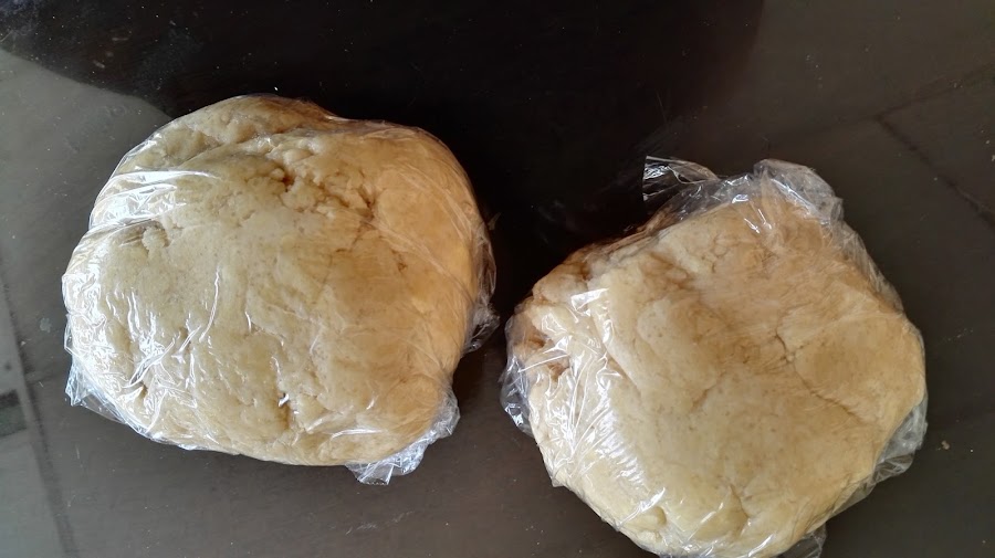 Cuando consigamos una masa uniforme, la separamos en dos partes, una ligeramente más pequeña que la otra, envolvemos en plástico de cocina y refrigeramos por 30 minutos.