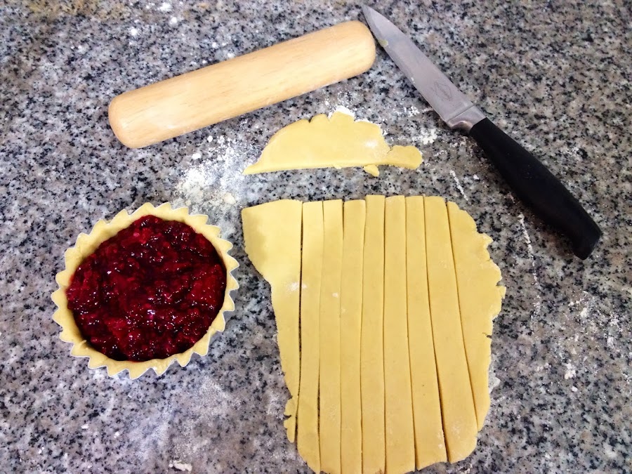 3. Saca tu masa de la nevera y empieza a estirar pequeñas porciones de masa de aproximadamente 3 milímetros de grosor y forra los moldes de pie, retira los excesos con el rodillo y rellena con suficiente mermelada de moras. (si vas a realizar un solo molde mediano, estira un poco mas de la mitad de la masa y forra)