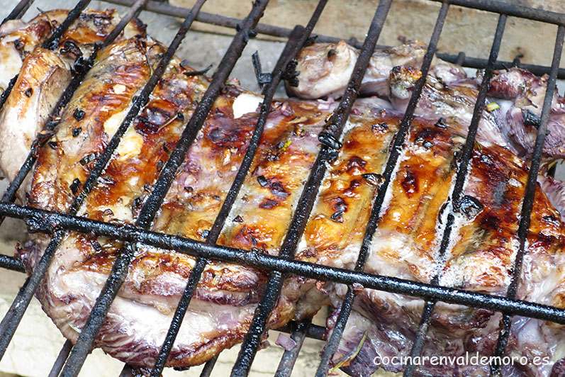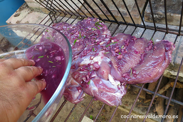Ponemos la carne en la parrilla, con los “tropezones” de la marinada, y guardamos el líquido para ir hidratando la pierna mientras se asa.