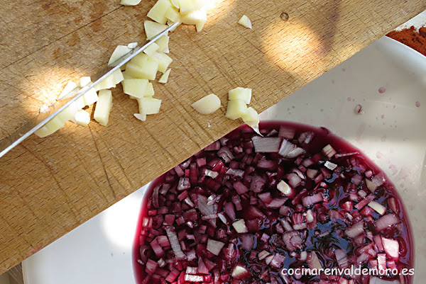 Salamos la pierna y reservamos. Preparamos la marinada picando la chalota, el romero (si es fresco), los ajos y lo mezclamos todo en un bol con el aceite y el vino tinto. Salamos y salpimentamos la marinada (si no salamos la marinada absorberá la sal del cordero y quedará soso).