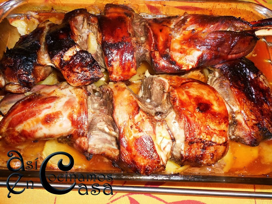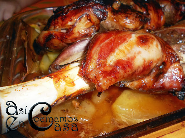 Así preparado lo metemos al horno. El tiempo va a depender del peso total de la pierna, pero permitidme que os dé un consejillo. Cuando creáis que ya está, que habrá pasado algo más de 1 hora, dejad que se acabe de hacer por lo menos otra media hora, quizás sin que esté el horno tan fuerte para que no se os queme de fuera. Así se acabará de hacer bien por dentro y quedará más tierno y jugoso.