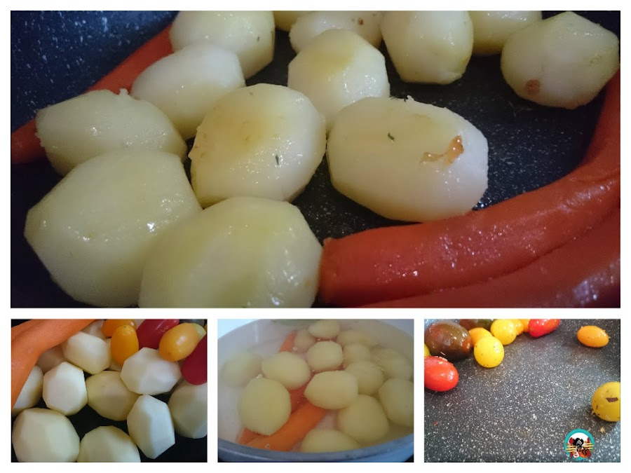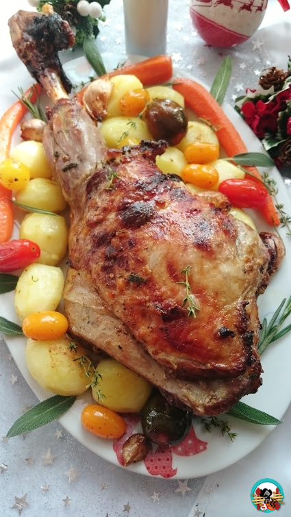 4.- Preparamos la guarnición: Pelamos las verduras, ponemos una olla con agua a hervir. Añadimos las verduras, bajamos a fuego medio y cocinamos 30 minutos hasta que las patatas y las zanahorias estén tiernas. Escurrimos bien, en una sartén añadimos la margarina y saltemos unos minutos las verduras hasta que estén un poco doradas. en la misma sartén saltemos unos minutos los tomates. Servimos la pierna de cordero con la guarnición de verduras y la salsa del asado. Decoramos unas ramas frescas de: tomillo, romero y salvia.