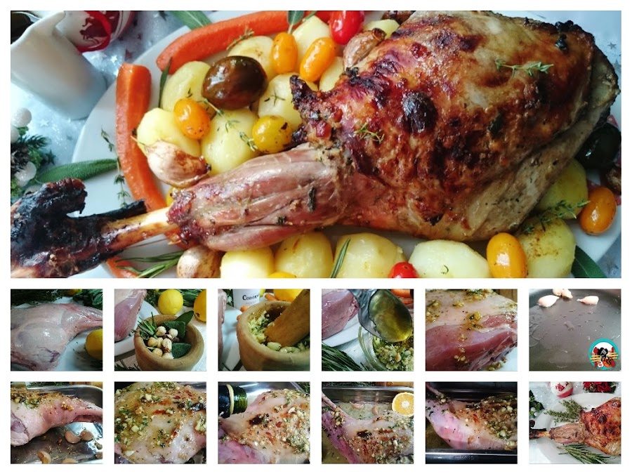 1.- Hacemos un majado con las avellanas, 3 dientes de ajo,sal y las hierbas aromáticas. Lo machacamos todo en el mortero, añadimos 2 cucharadas de miel y un poco de aceite de oliva. Mezclamos bien todos los ingredientes. Untamos la pierna de cordero con este macerado, salpimentamos al gusto, ( deja que la carne se macere 8 horas en la nevera).