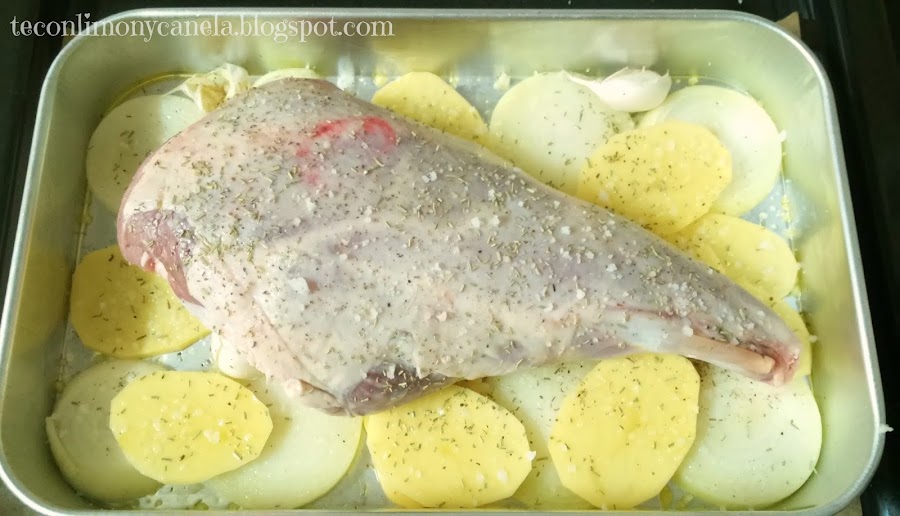 Sobre la cama de patata y cebolla colocamos la pierna de cordero.
