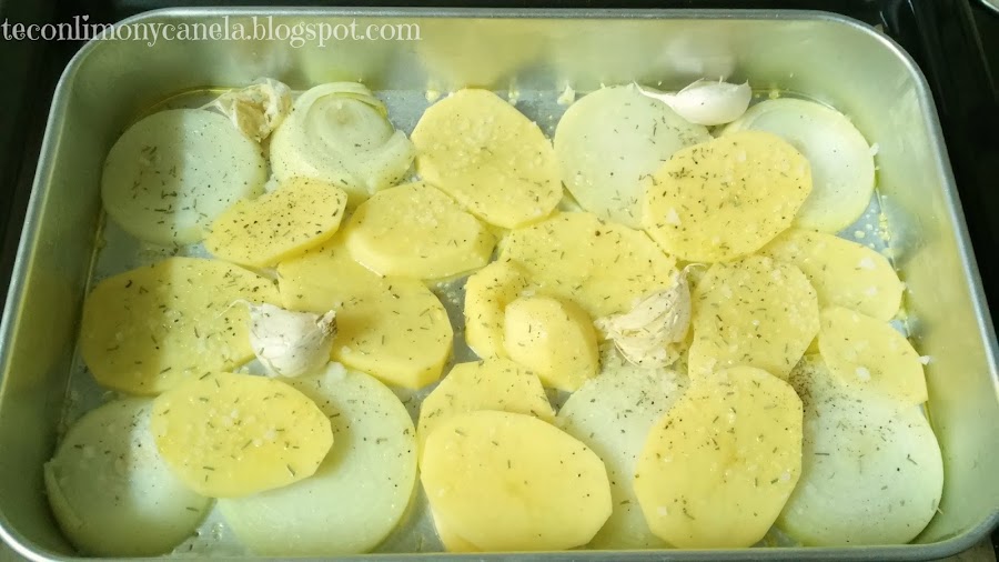 Rociamos la fuente de horno con aceite en spray, o lo untamos, y disponemos sobre ella la patata y la cebolla, peladas y cortadas en rodajas, y los ajos, machacados con un golpe seco de la hoja de un cuchillo.