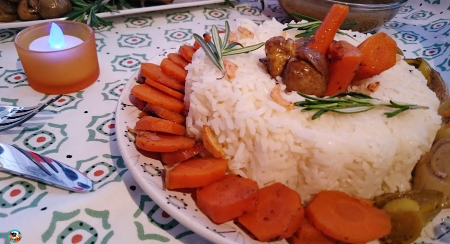 6.- Preparamos la guarnición: En un cazo ponemos agua a hervir, le añadimos la sal, la hoja de laurel y un poco de aceite. Añadimos el arroz y lo cocinamos 20 minutos o siguiendo las intrusiones del fabricante. Escurrimos bien el arroz y lo ponemos en un molde de corona. Pelamos el ajo, lo cortamos en laminas y doramos en un poco de aceite de oliva. decoramos la corona con los ajos y las ramas de romero. Rellenamos el centro de la corona con las verduras y algunas castañas. Alrededor de la corona de arroz ponemos las zanahorias y el puerro. Servimos la pata de carne cortada con las verduras ( le quitamos los hilos) la guarnición de arroz y el caldo del asado.