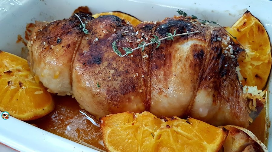 3.- Horneamos la pierna de pavo 50 o 60 minutos con el horno precalentado a 180º. A la mitad del tiempo le damos la vuelta a la pierna de pavo para que se cocine bien por todos los lados, rociamos la carne durante la cocción con el jugo que se desprende de la carne y de la fruta. Una vez este hecha la carne la retiramos del horno, le quitamos los hilos y cortamos en rodajas.