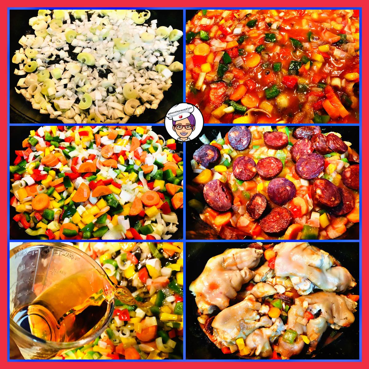 Pasamos todas la verduras a la crockpot , añadimos el chorizo y ponemos los pies.