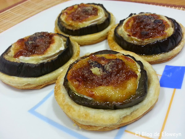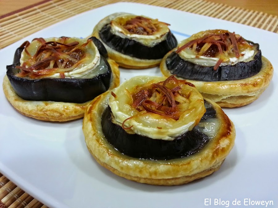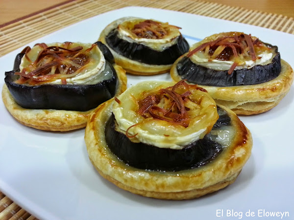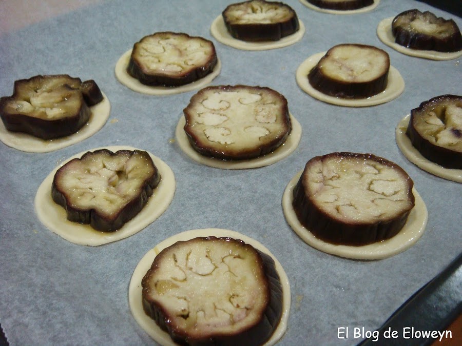 Extender la lámina de hojaldre y pasarle un poco el rodillo por encima. Cortar círculos con un cortador que tenga el diámetro un poquito más grande que la berenjena. Yo usé un aro de emplatar.