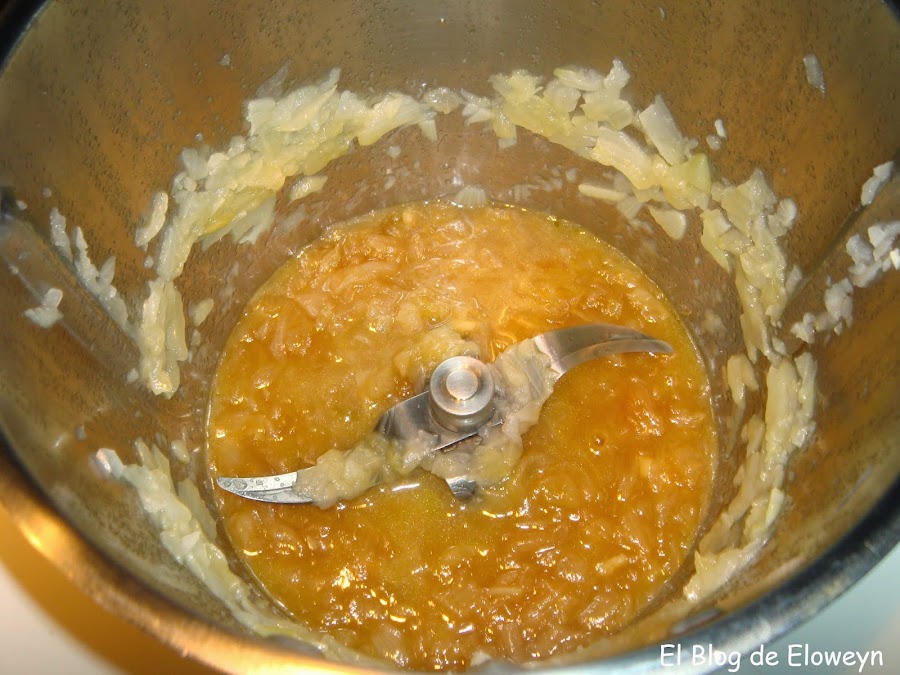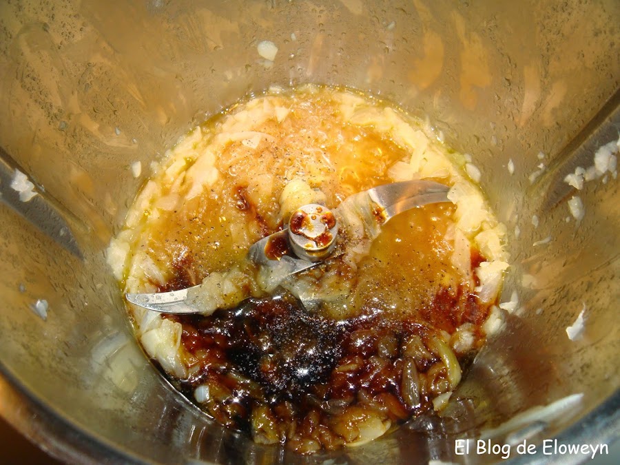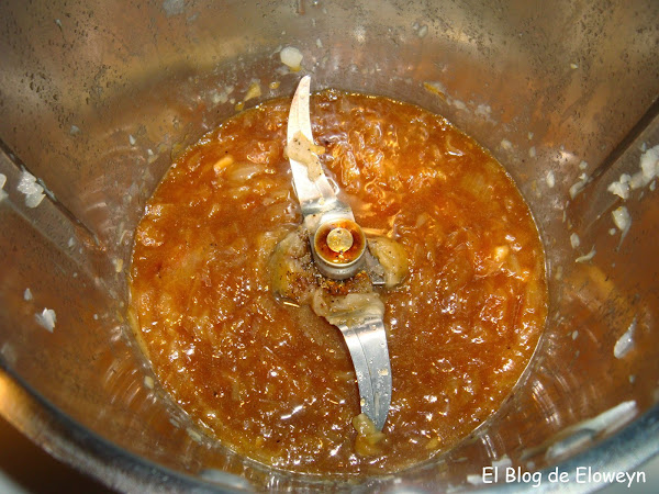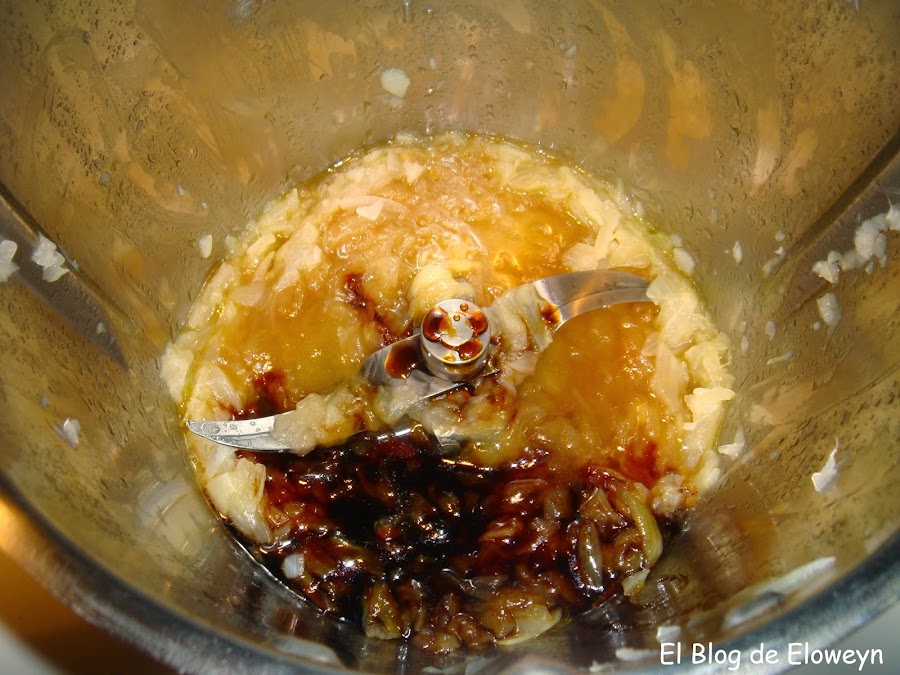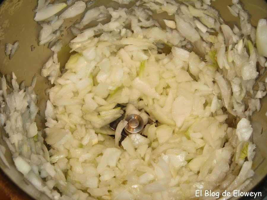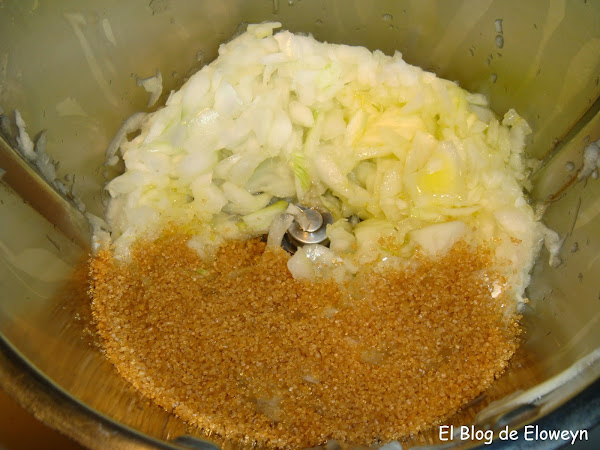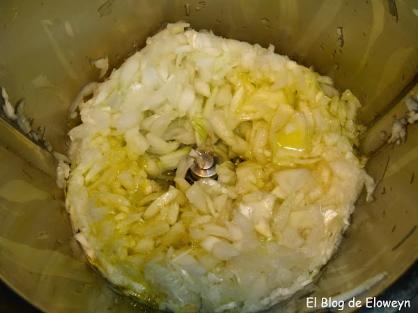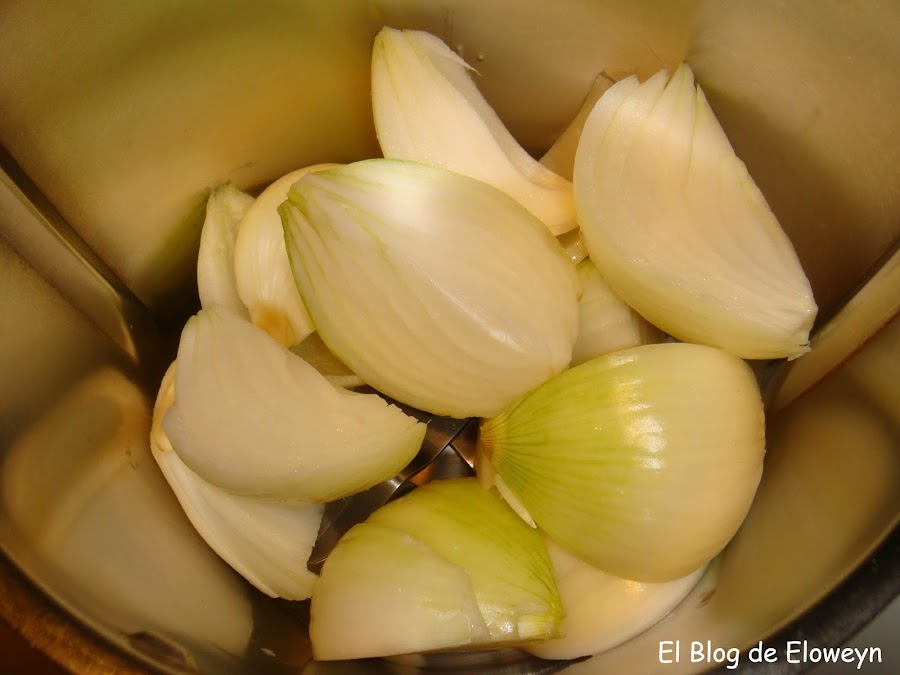 Programar 3 minutos, 100º, giro a la izquierda, velocidad cuchara. Si véis que la cebolla está demasiado líquida, en lugar de 100º, podéis poner la temperatura varoma para que se evapore un poco el líquido.