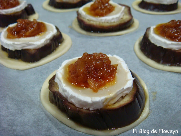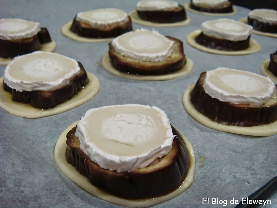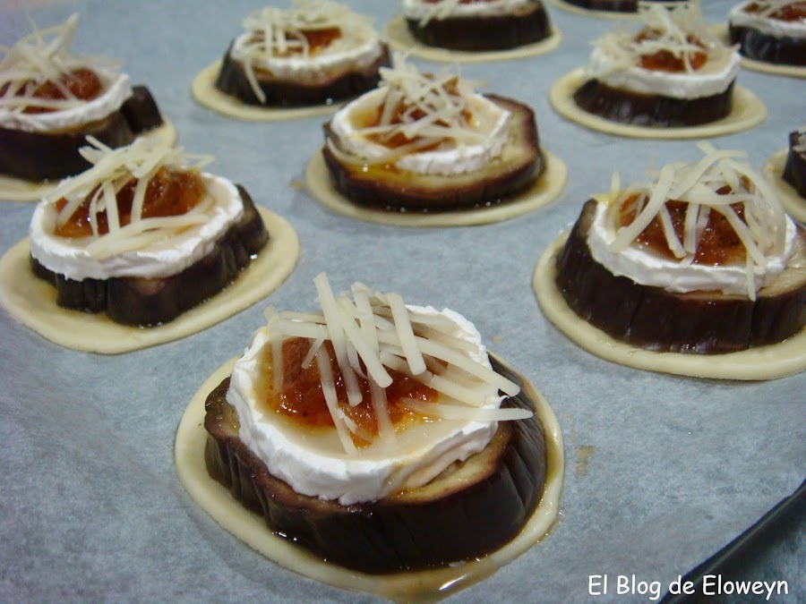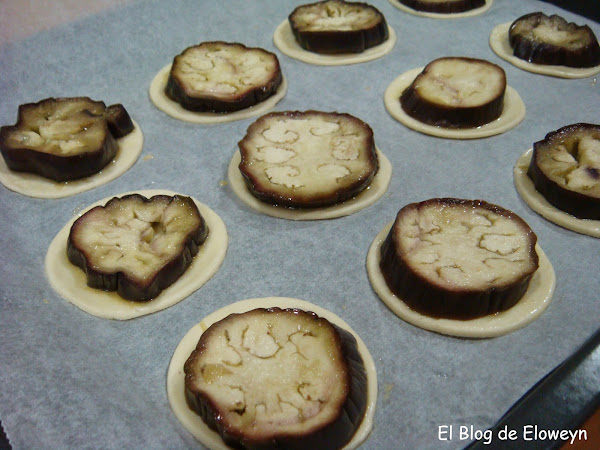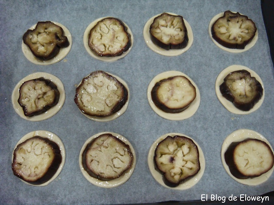 Colocar sobre cada uno de los círculos una rodaja de berenjena procurando que quede bien centrada.