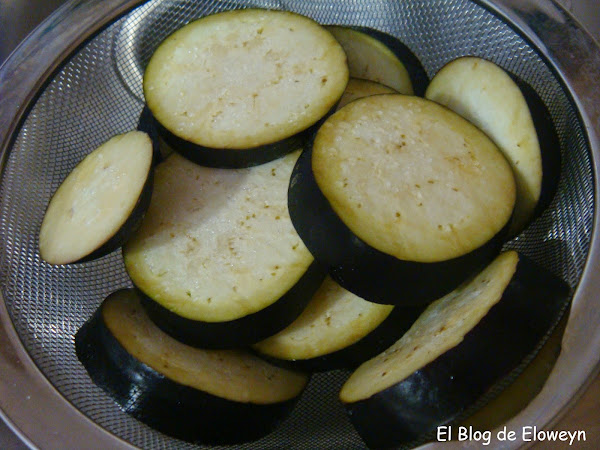 Lavar la berenjena y partirla en rodajas de medio centímetro de grosor. Ponerla con abundante sal en un colador durante una media hora para que sude y no amargue.