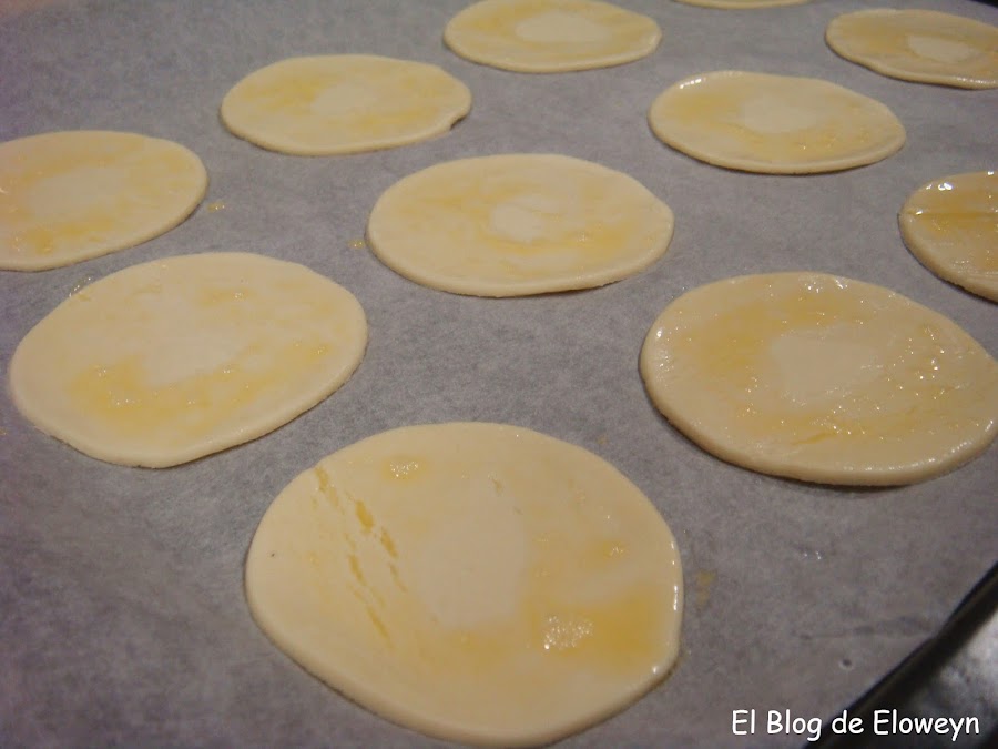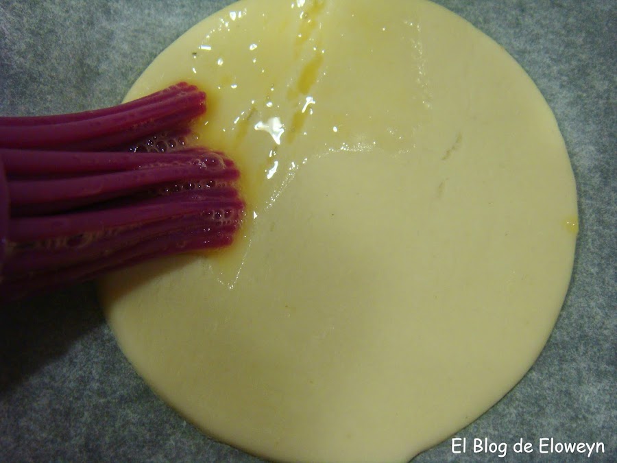 Batir un huevo y pintar los bordes de los círculos con un pincel. De esta forma, el hojaldre quedará dorado.
